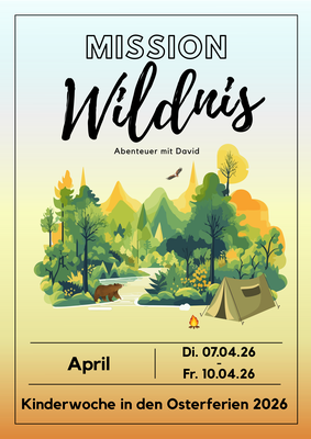 Dieses Jahr tauchen wir ein in die „Mission Wildnis“ und erleben eine Woche voller Spass, Spiel und Spannung. Gemeinsam mit einem mutigen jungen Mann entdecken wir aufregende Abenteuer, starken Glauben und echte Heldengeschichten!